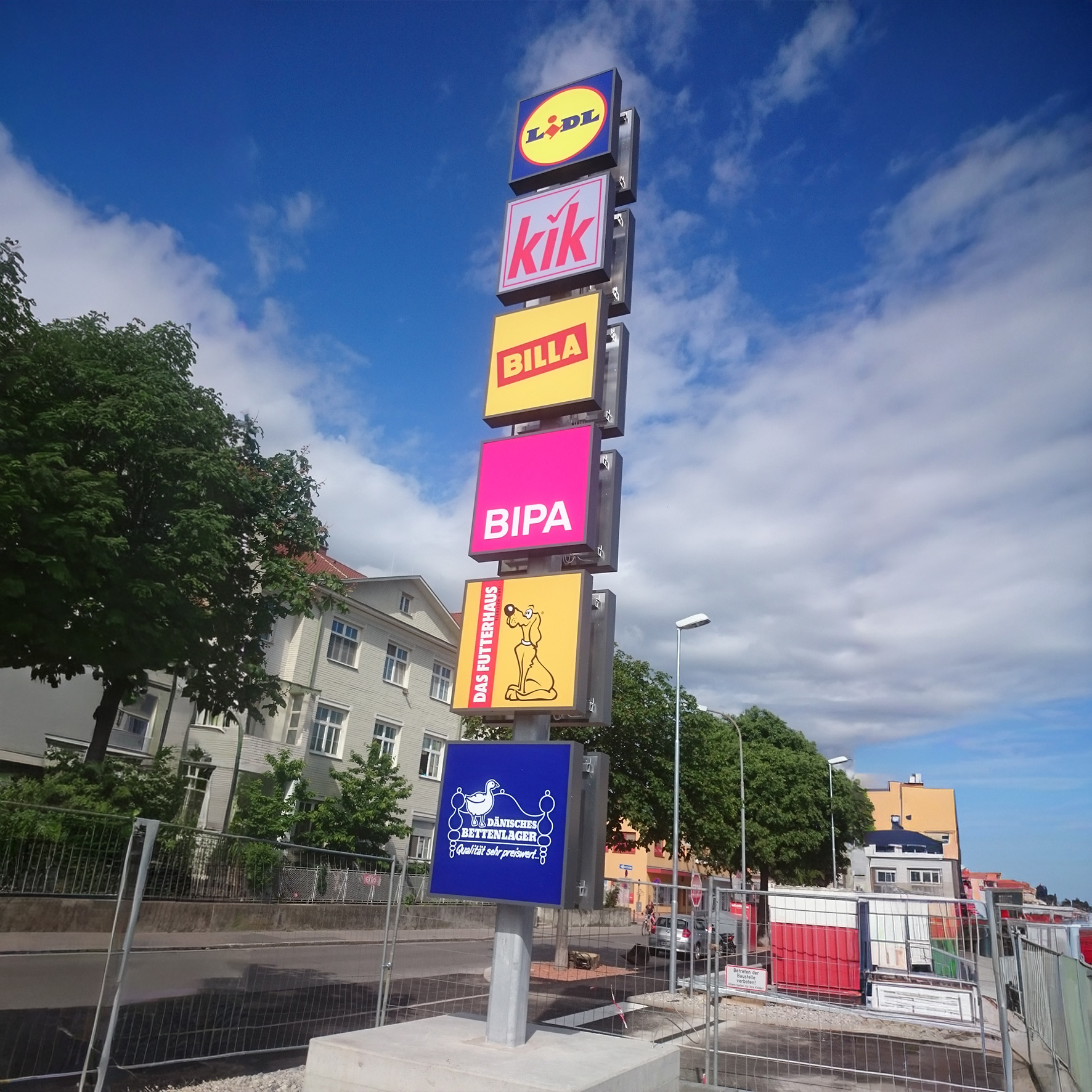 • Autohäuser & Gewerbeparks: Großflächige, beleuchtete Türme für Markeninszenierung